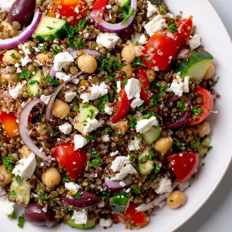 - In a large bowl, combine cooled quinoa, lentils, chickpeas, cherry tomatoes, cucumber, bell pepper, red onion, olives, and parsley. Toss gently so everything mingles without crushing the softer ingredients.